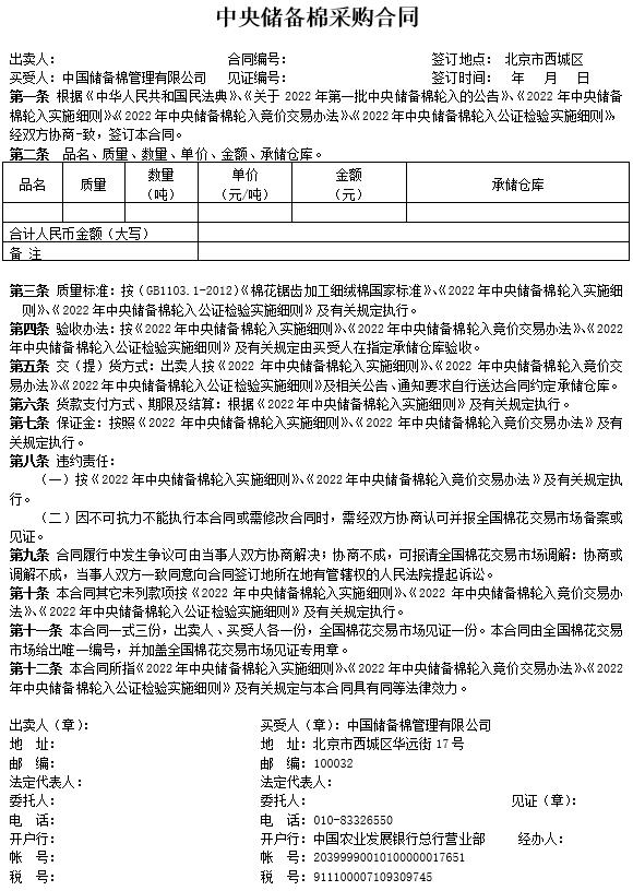 第十条 交易市场根据竞价交易成交结果生成《中央储备棉采购合同》。交储企业须在成交后次日起5个工作日内签订合同,同时将拟交储棉花批次信息作为附件提交交易市场,交易市场确认所提交批次已纳入新疆专业监管、由交储企业加工、且在新疆监管库公证检验结果颜色级白棉3级及以上的比例不低于80%后,办理合同见证。