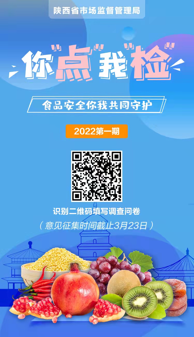 根据《陕西省市场监督管理局关于开展2022年度食品安全“你点我检”活动的通知》(陕市监发〔2022〕46号)安排,特制定《2022年全省食品安全“你点我检”第一期活动方案》,请结合实际认真组织落实,并广泛发动干部职工,积极参与和转发调查问卷海报(二维码见附件)。工作中如遇问题,请及时向省局反馈。