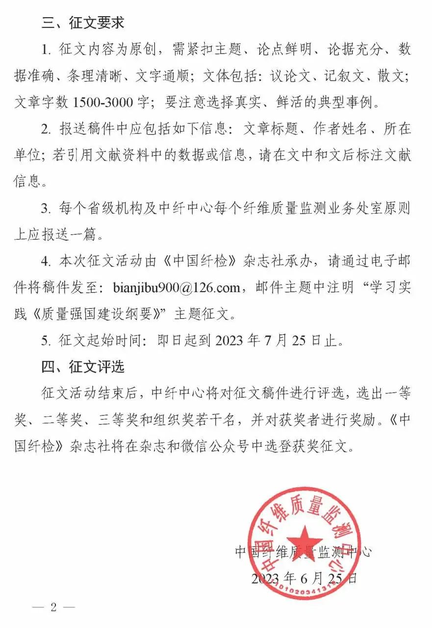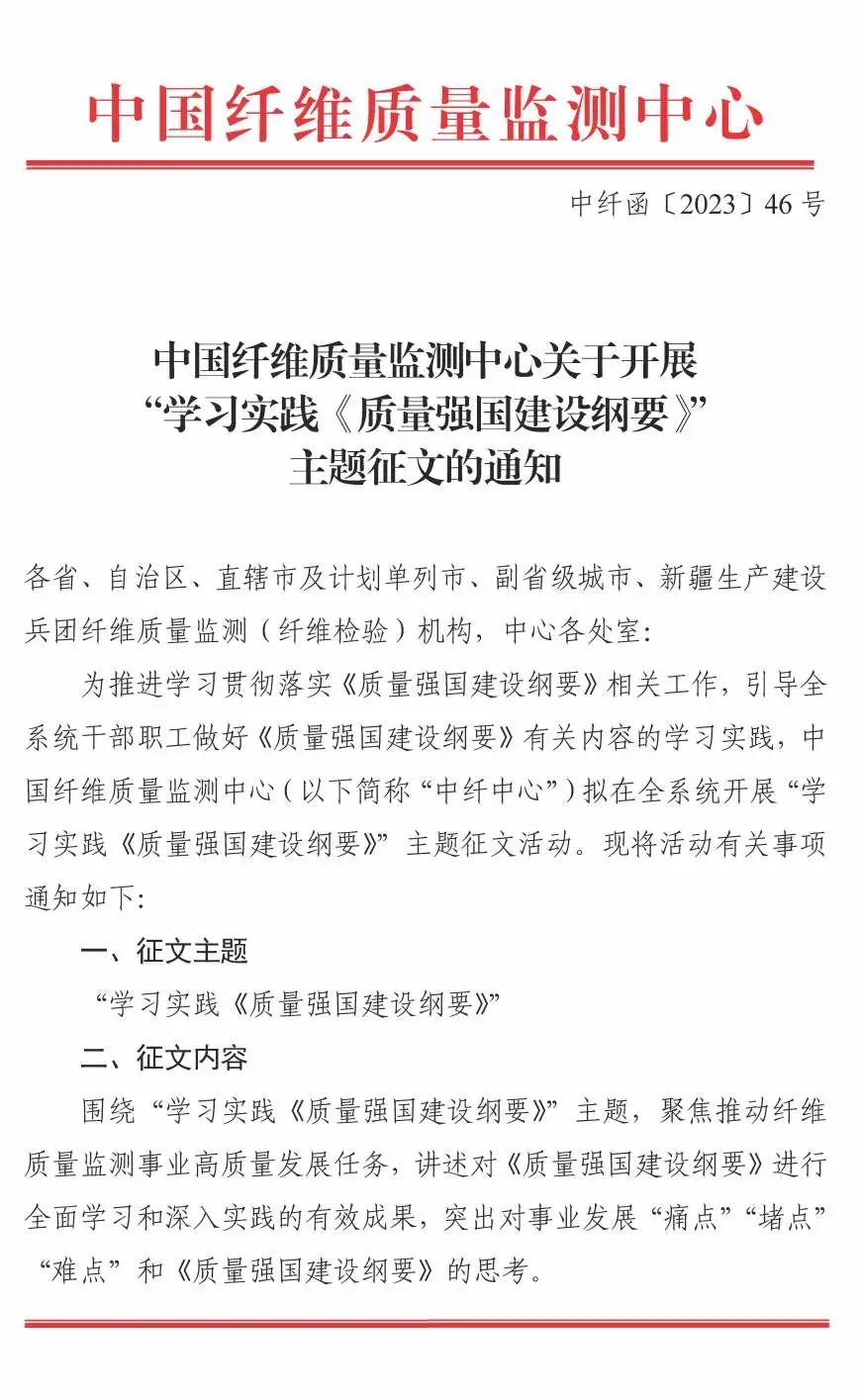 中国纤维质量监测中心关于开展“学习实践《质量强国建设纲要》”主题征文的通知