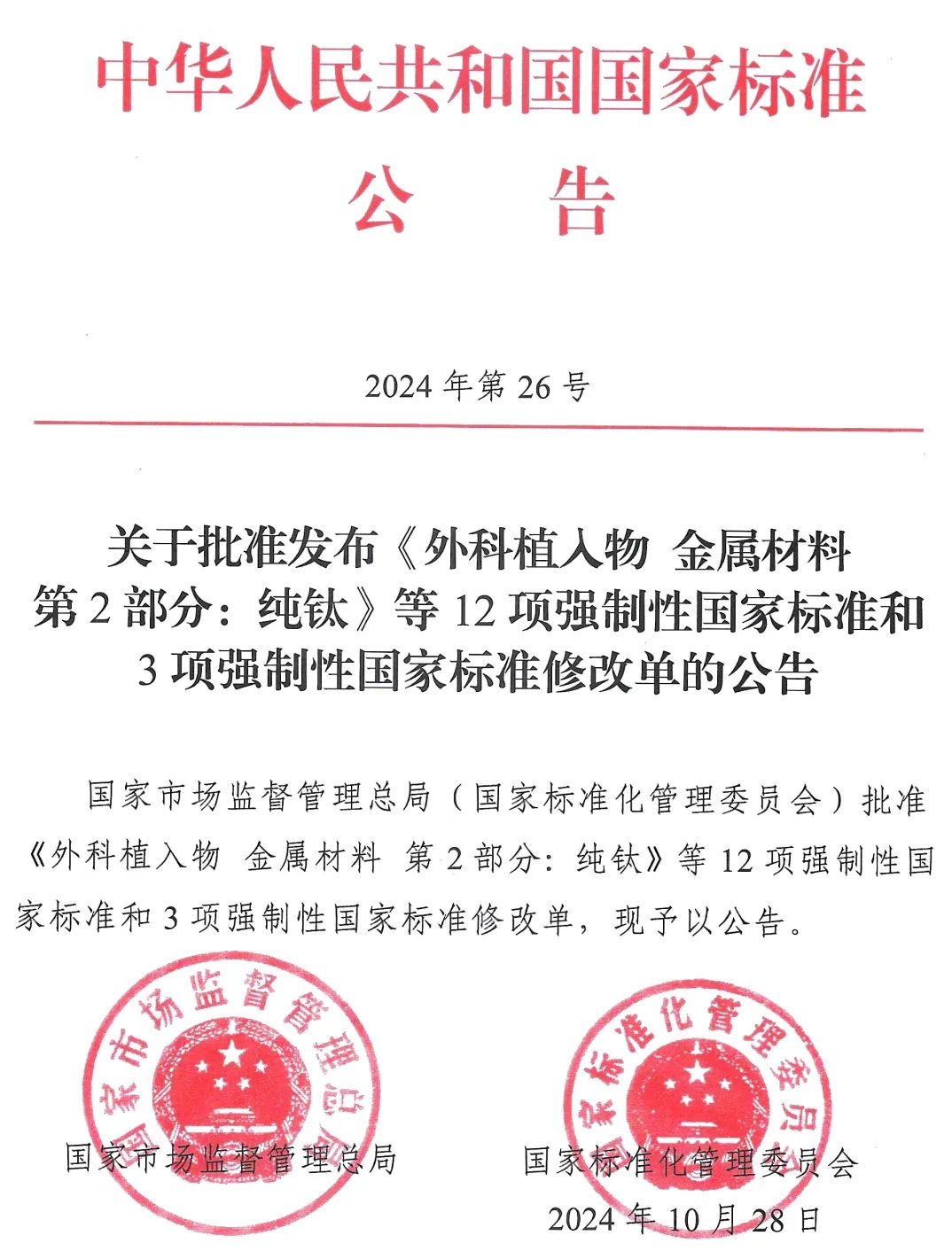 日前,《关于批准发布〈外科植入物 金属材料第2部分:纯钛〉等12项强制性国家标准和3项强制性国家标准修改单的公告》正式发布。具体内容如下: