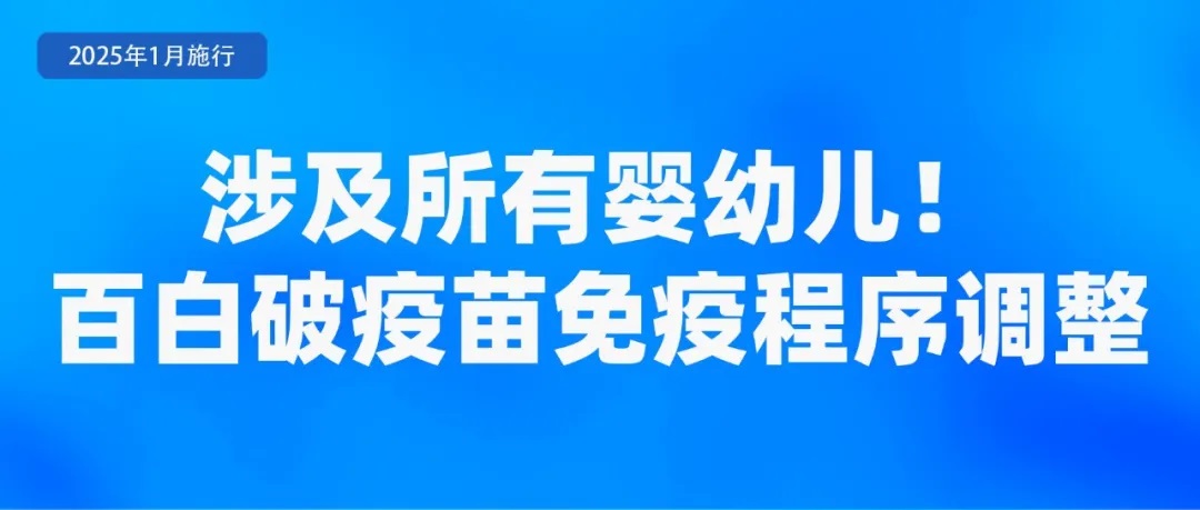 根据《关于国家免疫规划百白破疫苗和白破疫苗免疫程序调整相关工作的通知》要求:自2025年1月1日起,在全国范围内实施,将现行3月龄、4月龄、5月龄、18月龄各接种1剂次吸附无细胞百日咳-白喉-破伤风联合疫苗和6周岁接种1剂次吸附白喉-破伤风联合疫苗的免疫程序,调整为2月龄、4月龄、6月龄、18月龄、6周岁各接种1剂次百白破疫苗的免疫程序。