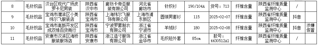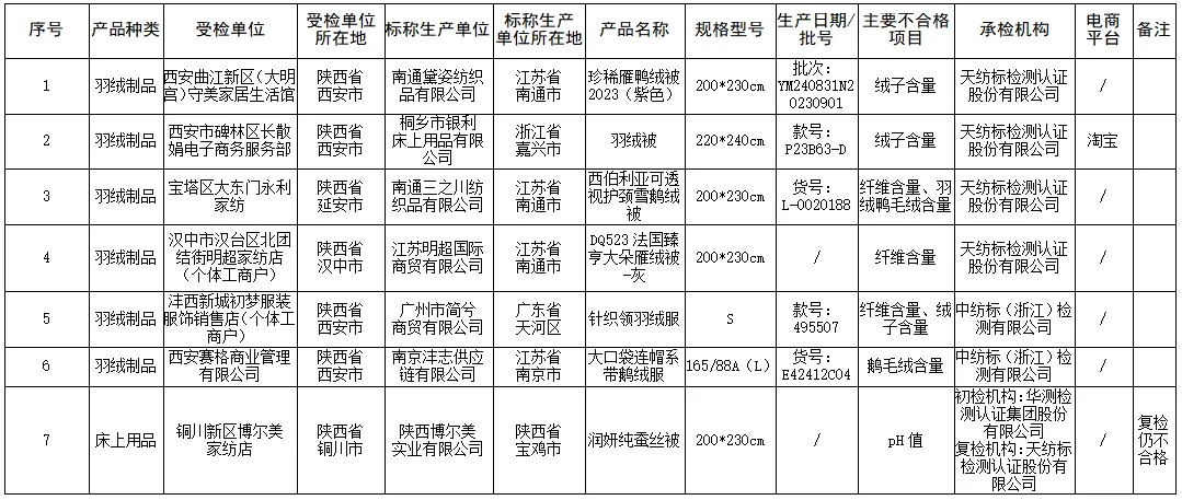 在西安、宝鸡、咸阳、铜川、渭南、延安、榆林、汉中、安康、商洛、杨凌等地区生产、流通及电商领域抽查了40家企业生产销售的40批次产品。抽查发现4批次产品不合格,不合格项目为纤维含量。