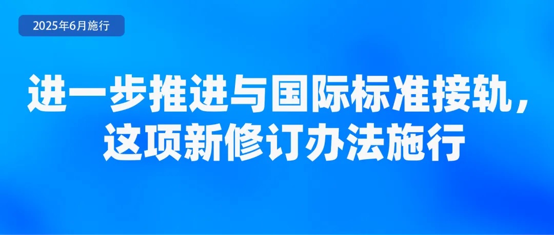 2025年6月1日起,市场监管总局修订出台的《采用国际标准管理办法》施行。修订的主要内容包括:一是明确所采用国际标准的范围和采标主体的范围。二是建立国际标准全过程跟踪机制。三是明确采标国家标准制定周期要求。四是强化版权政策要求。五是完善采用国际标准监督和纠错机制。