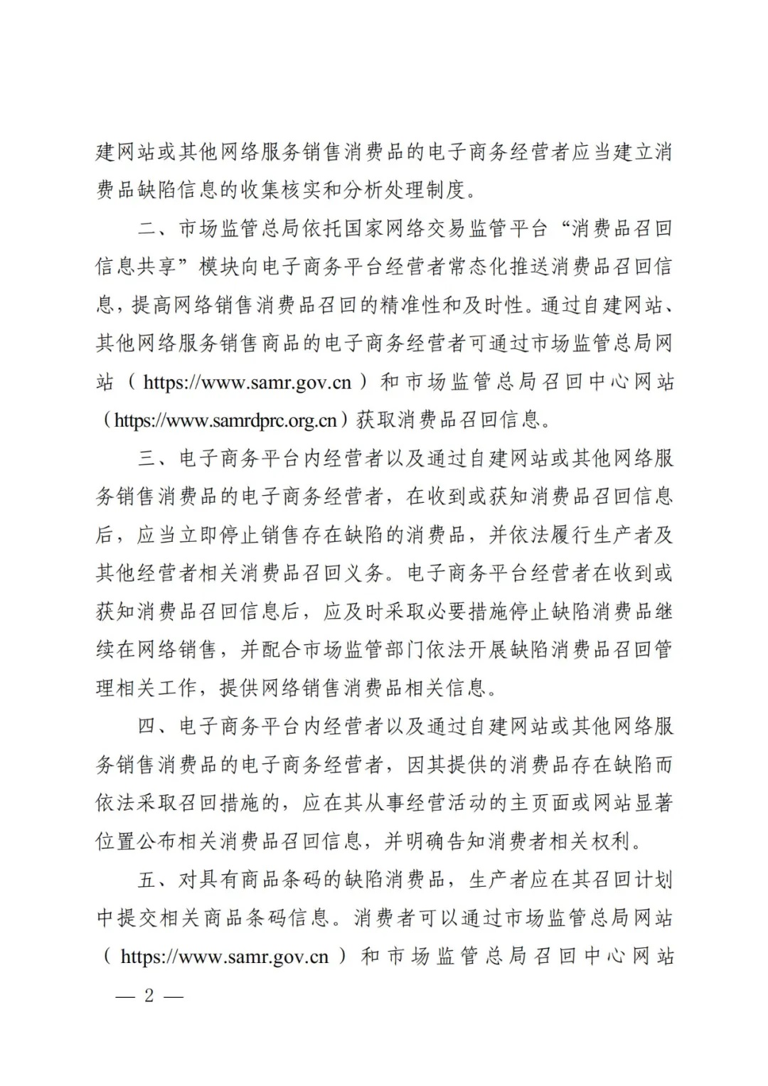 《公告》对网络销售消费品召回监管提出新要求:规定电子商务经营者需建立健全消费品缺陷信息收集处理机制,明确市场监管总局将向电商平台常态化推送消费品召回信息,细化电子商务经营者在收到消费品召回信息后需履行的义务,要求具有商品条码信息的生产者在召回计划中提供商品条码信息,明确跨境电商零售进口消费品的境内召回责任主体,提出市场监管部门将组织实施电商平台消费品安全与召回共治承诺。