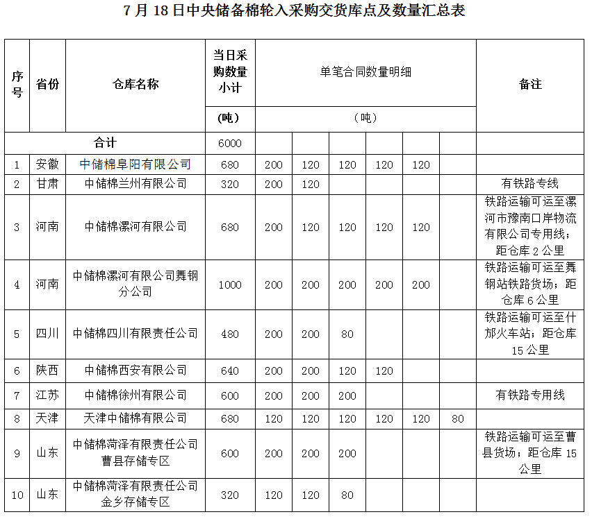 7月18日中央储备棉轮入采购交货库点及数量公告
