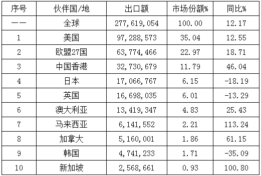 1-5月丝绸制成品对日、英、韩出口下降,对其他主要市场出口出现不同幅度增长,最大出口市场美国增幅与丝绸制成品整体增幅基本一致,马来西亚、新加坡涨幅超100%。美国市场份额基本与去年同期持平,欧盟、中国香港市场份额均有提升,但都不超过3个百分点,日本份额下滑2个百分点。(详见表5)