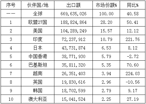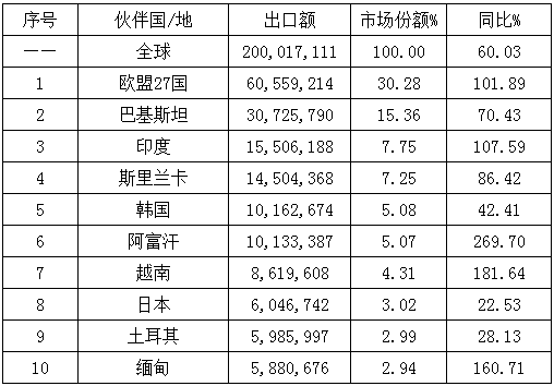 真丝绸缎对前十出口市场均有不同程度的增长,对欧盟、印度出口均翻一倍,对阿富汗、越南、缅甸出口涨幅巨大。与去年同期相比,欧盟市场份额增长6个百分点,巴基斯坦份额略降,印度、斯里兰卡份额均提升1-2个百分点。(详见表4)
