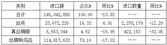 进口:丝类金额为455.25万美元,同比增长51.46%,数量为357.78吨,同比增长23.6%;绸缎金额为127.12万美元,同比下降35.5%;制成品金额为1587.24万美元,同比下降42.71%。