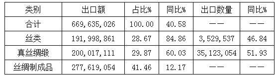 真丝绸商品出口额为6.7亿美元,同比增长40.58%,占我纺织品服装出口额的0.54%。同期纺织品服装出口额同比增长16%。