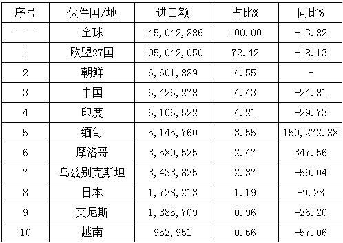 我国真丝绸商品自朝鲜进口同比净增长,自摩洛哥进口增幅近350%,自缅甸进口增幅巨大,自欧盟、日本等其余国家或地区进口出现不同程度下降。欧盟是我国真丝绸商品进口最主要来源地,占比近3/4,但今年1-5月较去年同期份额下降了近4个百分点。(详见表8)