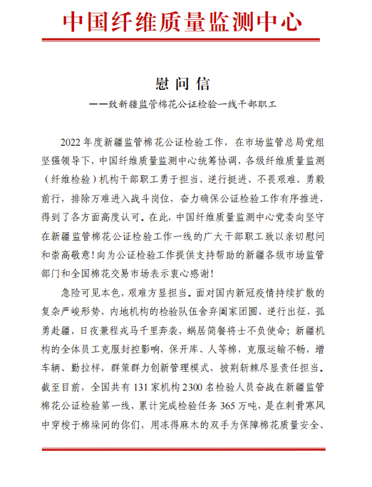 致新疆监管棉花公证检验一线干部职工的慰问信