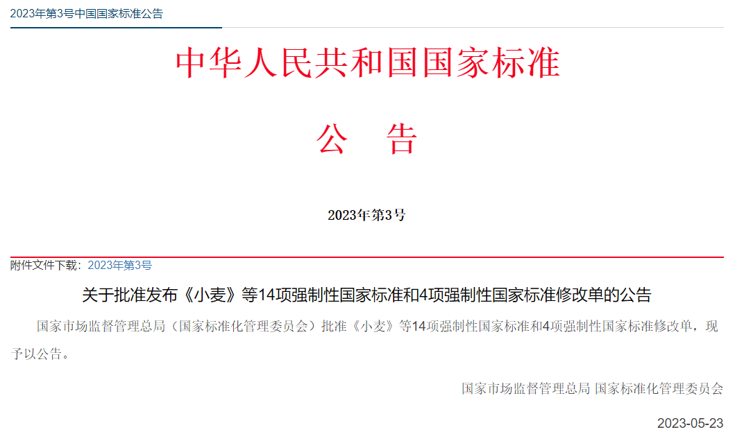 关于批准发布《小麦》等14项强制性国家标准和4项强制性国家标准修改单的公告