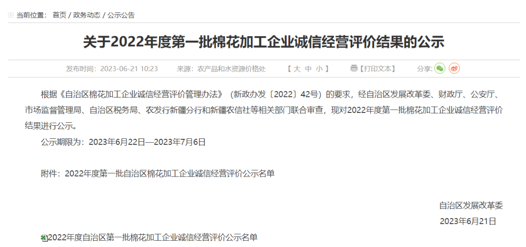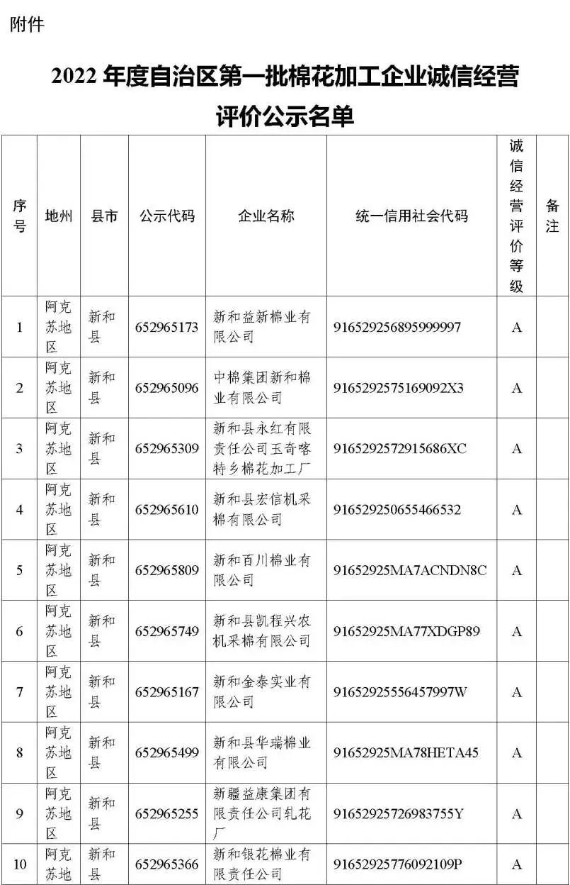 关注 | 关于2022年度第一批(478家)棉花加工企业诚信经营评价结果的公示(A级)