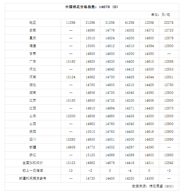 中国棉花价格指数(CC Index)及分省到厂价(10.20)