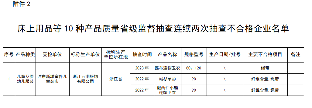 床上用品等10种产品质量省级监督抽查连续两次抽查不合格企业名单