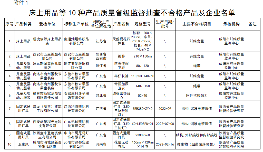 陕西省市场监督管理局关于2023年床上用品等10种产品质量省级监督抽查情况的通告