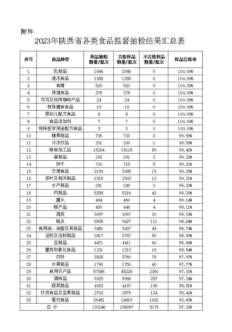 附件:2023年陕西省各类食品监督抽检结果汇总表