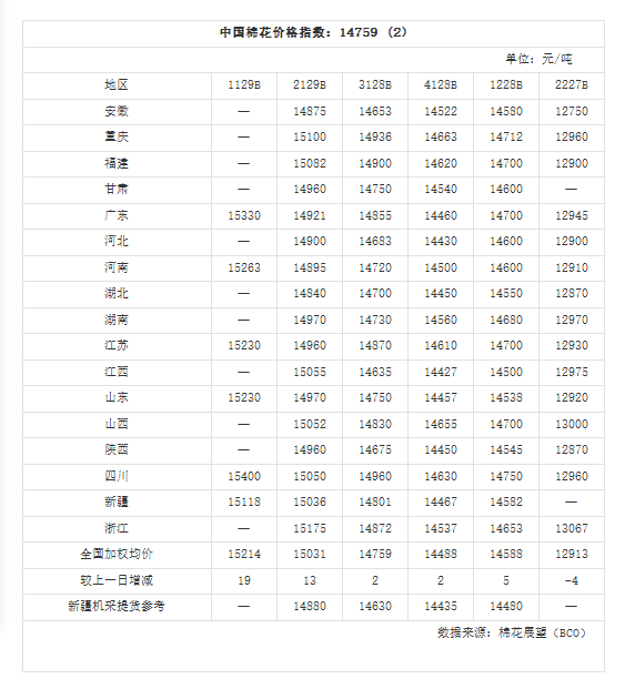 中国棉花价格指数(CC Index)及分省到厂价(10.8)
