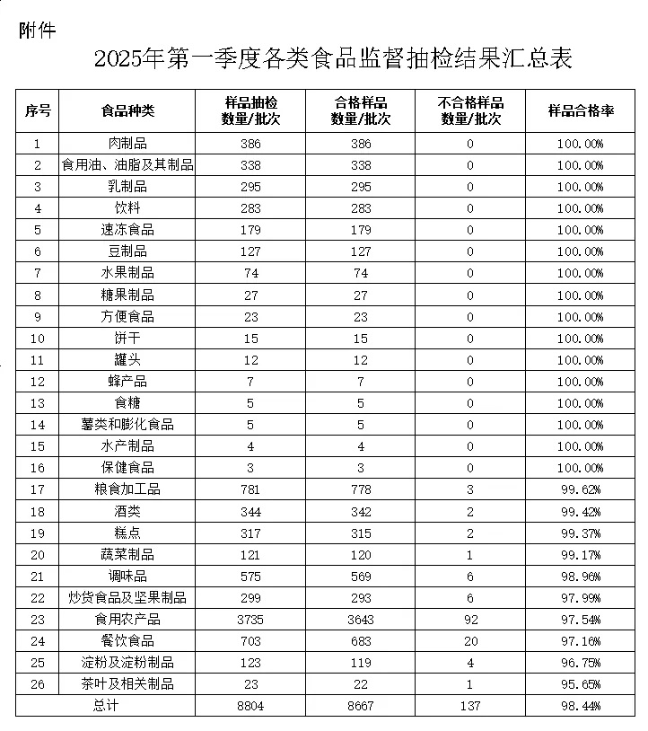2025年第一季度,我省共完成并公布8804批次食品样品监督抽检结果,所检项目全部合格的8667批次,不合格的137批次,总体合格率为98.44%。