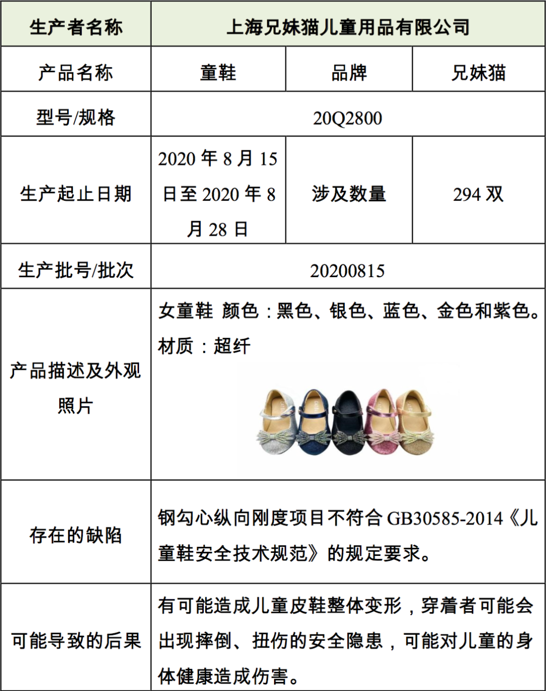 上海兄妹猫儿童用品有限公司于2022年6月29日至2022年9月28日召回2020年8月15日至2020年8月28日期间生产的型号为20Q2800、生产批号为20200815的“兄妹猫”童鞋,涉及294双。