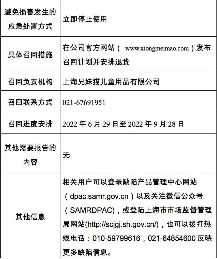 请消费者立即停止使用该产品,上海兄妹猫儿童用品有限公司将在官方网站(www.xiongmeimao.com)发布召回计划并安排退货。