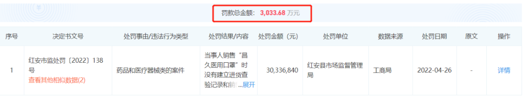 武汉康本龙医疗器械公司销售无合格证口罩被罚3000多万元