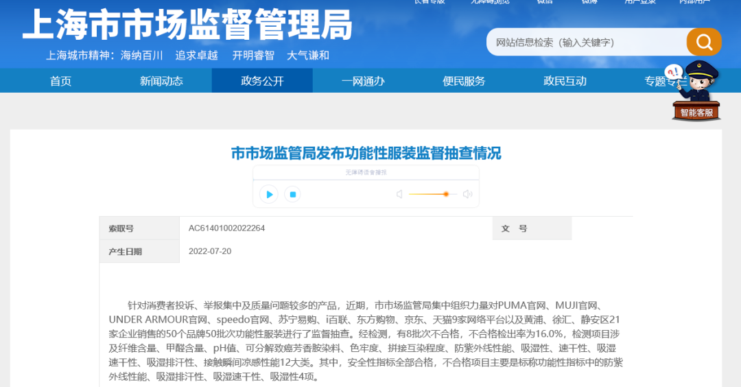 上海:“迪卡侬”、“POLO SPORT”等品牌功能服不合格