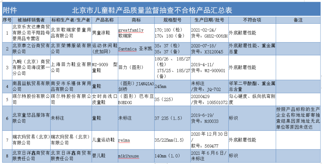 近期,北京市市场监管局对该市生产、销售的儿童鞋开展了质量监督抽查,共检出8组批产品不合格,存在的主要质量问题是儿童鞋的外底耐磨性能、重金属总量等项目不符合标准要求。不合格童鞋品牌涉及:greatfamily 歌瑞家、Santmica 圣米凯、回力、JIANQIAO剑桥、巴布豆BOBDOG、reima、mikihouse等。