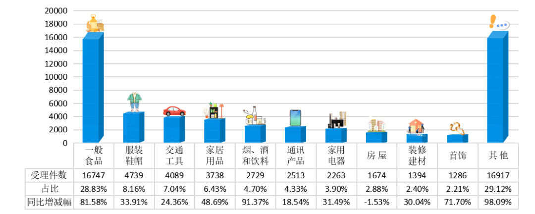 商品类投诉位居前三位的分别是:一般食品、服装鞋帽、交通工具,合计占商品类投诉总量的44.03%。此外,烟、酒和饮料投诉量由去年同期的第8位升至第5位,首饰投诉量取代计算机产品投诉量,排位进入前10位。其余排位基本一致。