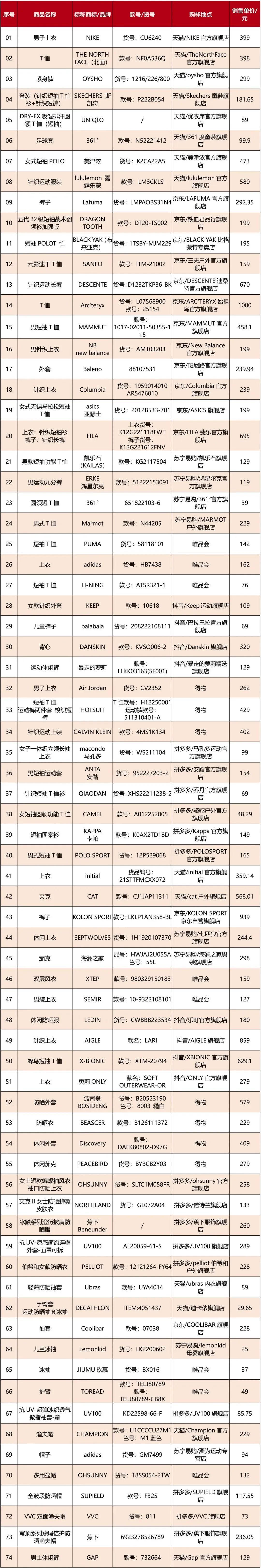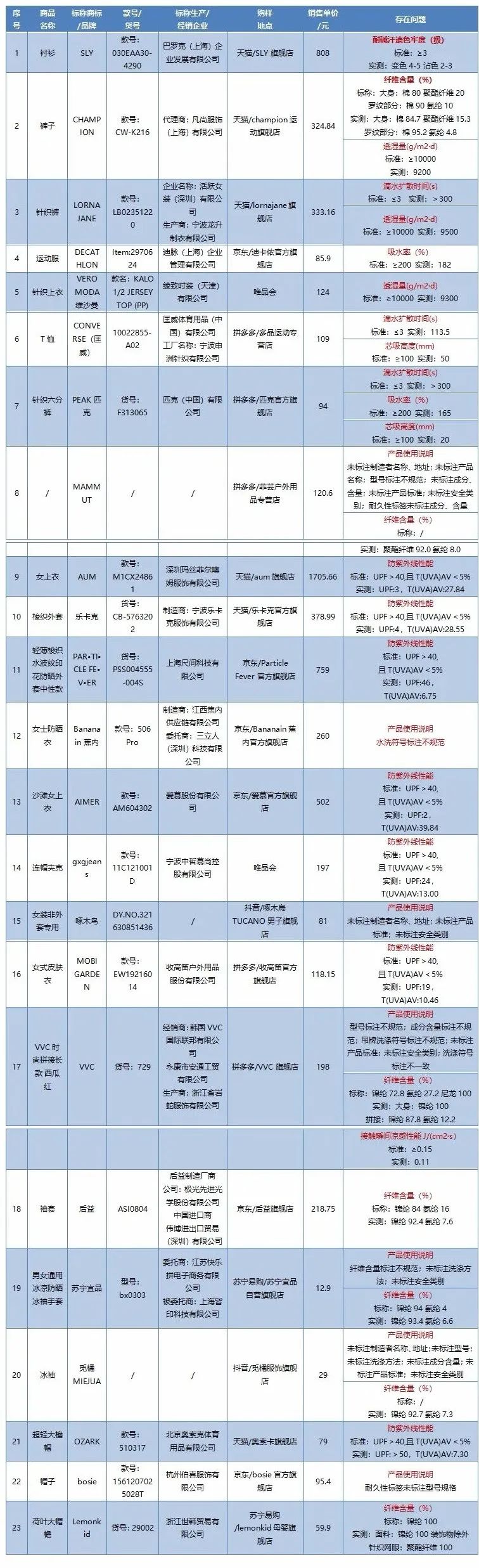 经测试,吸湿速干防紫外线服装样品中,6家电商平台销售的23款样品未达到相关标准。其中项目未达标的涉及样品标称品牌有: