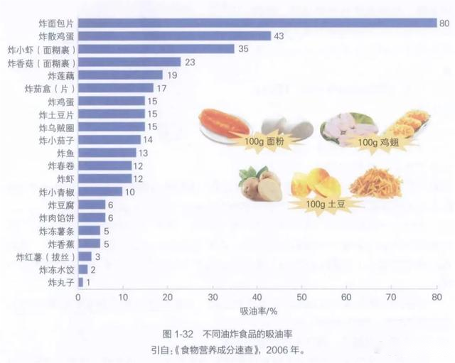 煎炸的食物,因为吸了油,吃起来香,但是热量也不低。比如,炸面包片的吸油率高达 80%,炸散鸡蛋的吸油率高达43%。
