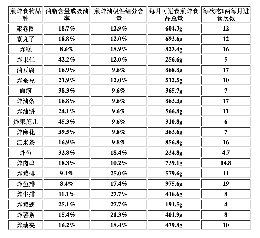在每次吃一两、每次只吃一种煎炸食品的前提下,油条每月最多能吃17次,炸薯条每个月可以吃8次,炸鸡翅每个月只能吃4次。