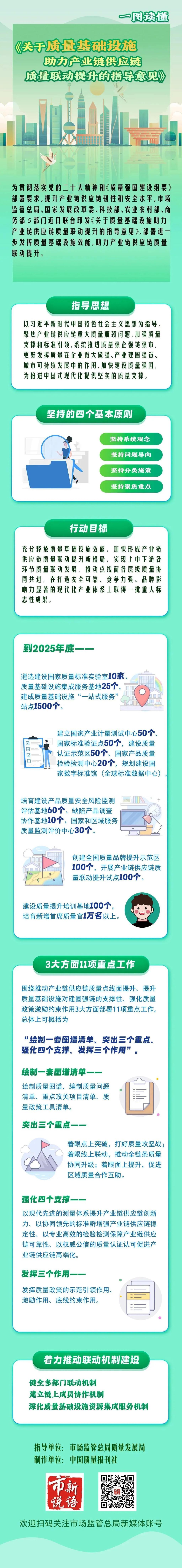 围绕《质量强国建设纲要》目标,聚焦新能源汽车、集成电路、人工智能、量子信息等战略性新兴及未来产业,统筹纺织服装、家用电器、工程机械等传统优势产业,深入开展质量基础设施助力产业链供应链质量联动提升行动,充分释放质量基础设施效能,实现上中下游各环节质量联动发展,点线面各层级质量协同共进,产业链供应链质量联动提升新格局基本形成,在打造安全可靠、竞争力强、品牌影响力显著的现代化产业体系上取得一批重大标志性成果,质量在企业做大做强、产业建圈强链、城市可持续发展中的作用更加彰显。