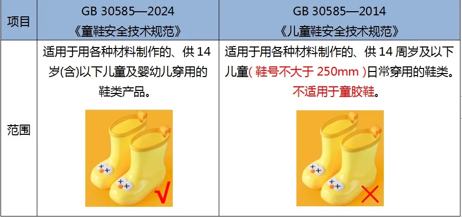 新标准适用范围删除了童鞋鞋号不大于250mm的限制,且新标准同样适用于童胶鞋!