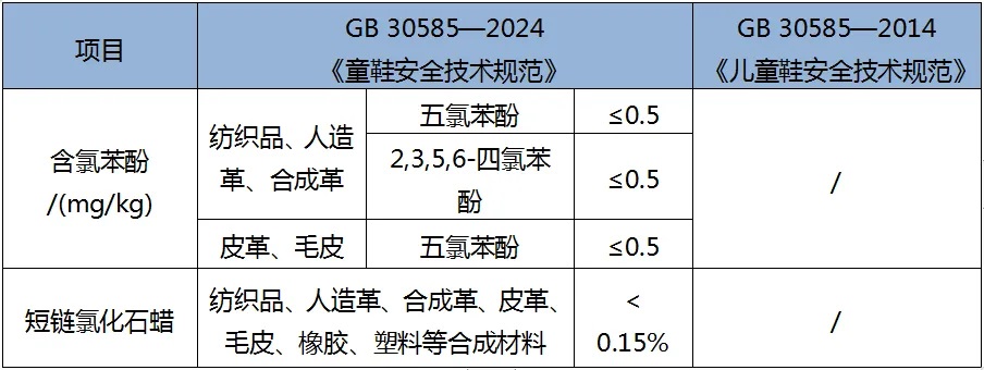 3. 增加了含氯苯酚、短链氯化石蜡限量物质要求