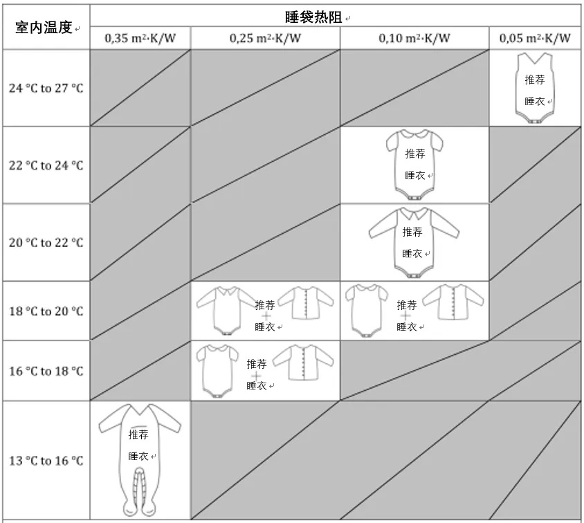 当婴幼儿处于睡眠过程中,体温过高和过低除了受到睡袋面料款式影响外,也受到了其他多重因素,包括孩子自身的健康情况、睡眠的环境温度、婴儿床的床垫、婴儿所穿的睡衣等。所以,家长在选购婴童睡袋时,最好根据应季的室内温度来参考睡袋热阻和推荐睡衣款式,参考表格如下: