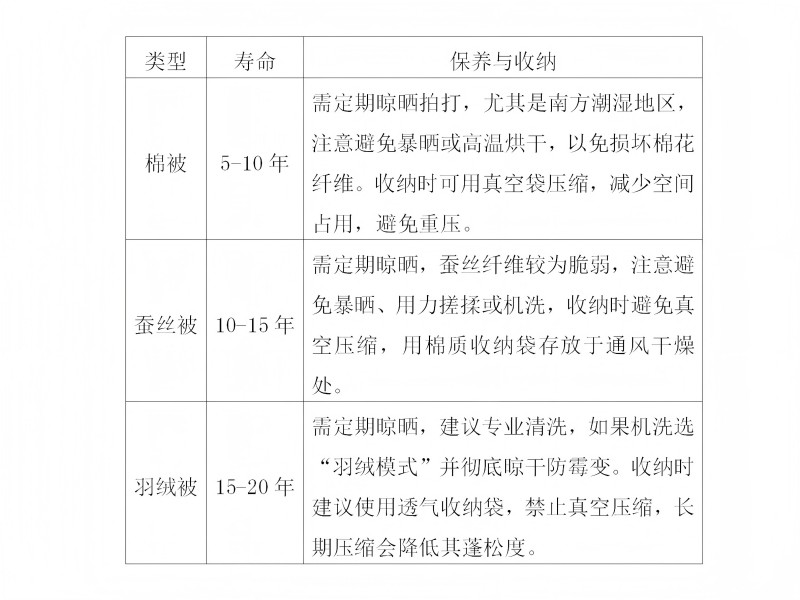 蚕丝被:蚕丝被透气性极佳,并且具有良好的吸湿排湿功能,适合湿润地区或夏季使用。