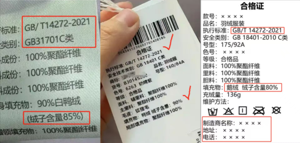 2.查细节。优先选购产品标准为GB/T 14272-2021的产品,婴童羽绒服还应注意是否标注GB 31701。关注羽绒种类、绒子含量等信息:羽绒服填充物一般为鸭绒或鹅绒,绒子含量越高越好,最高为95%,羽绒棉非羽绒制品,应注意区分。不宜选购有异味或拍打、揉搓后有绒毛钻出的产品。