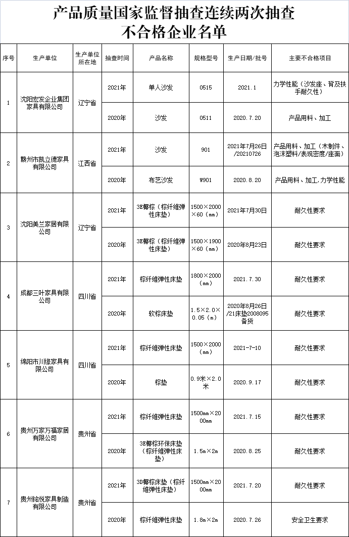 (二)督促落实主体责任。将本次抽查不合格产品情况通报地方政府及相关部门,采取有力措施,督促企业依法落实产品质量安全主体责任,引导企业严格按照标准组织生产,保障产品质量安全。特别是广东省、江苏省、重庆市和贵州省市场监管部门更要高度重视,深入分析原因,切实抓好本区域棕纤维弹性床垫的质量治理工作。
