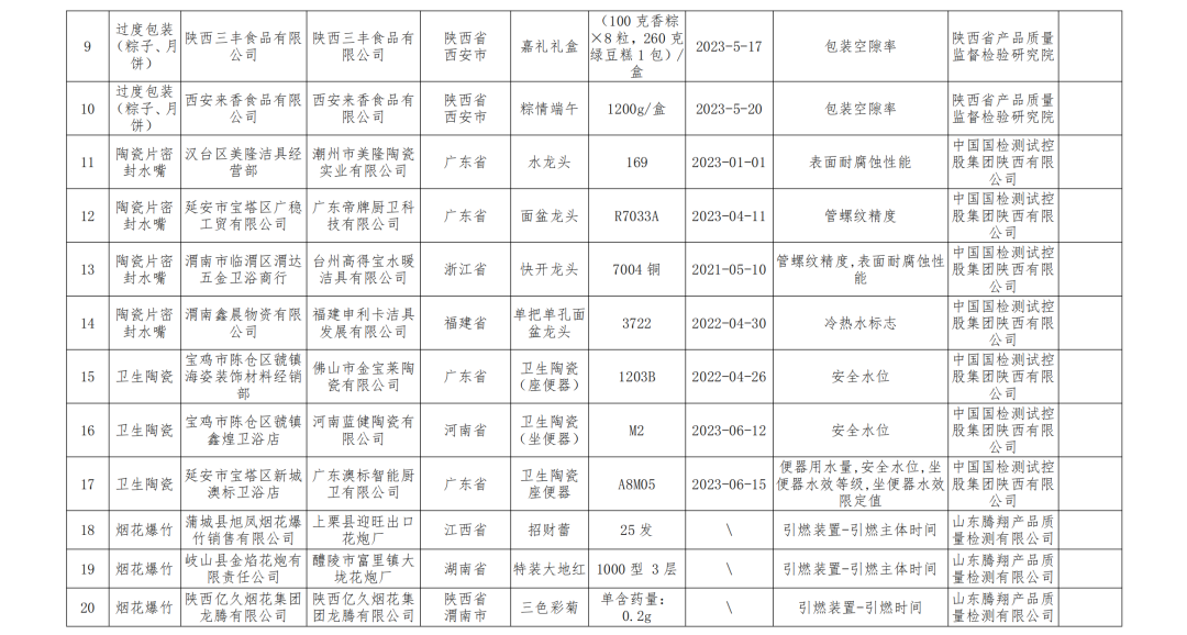 本次抽查产品为校服、带电作业用绝缘手套、过度包装(粽子、月饼)、陶瓷片密封水嘴、卫生陶瓷、烟花爆竹、非复合膜袋、复合膜袋、聚对苯二甲酸乙二醇酯(PET)瓶等9种产品。共抽查检验了246家企业的335批次产品,发现不合格产品23批次,包括校服2批次、带电作业用绝缘手套5批次、过度包装(粽子、月饼)3批次、陶瓷片密封水嘴4批次、卫生陶瓷3批次、烟花爆竹6批次(详见附件)。